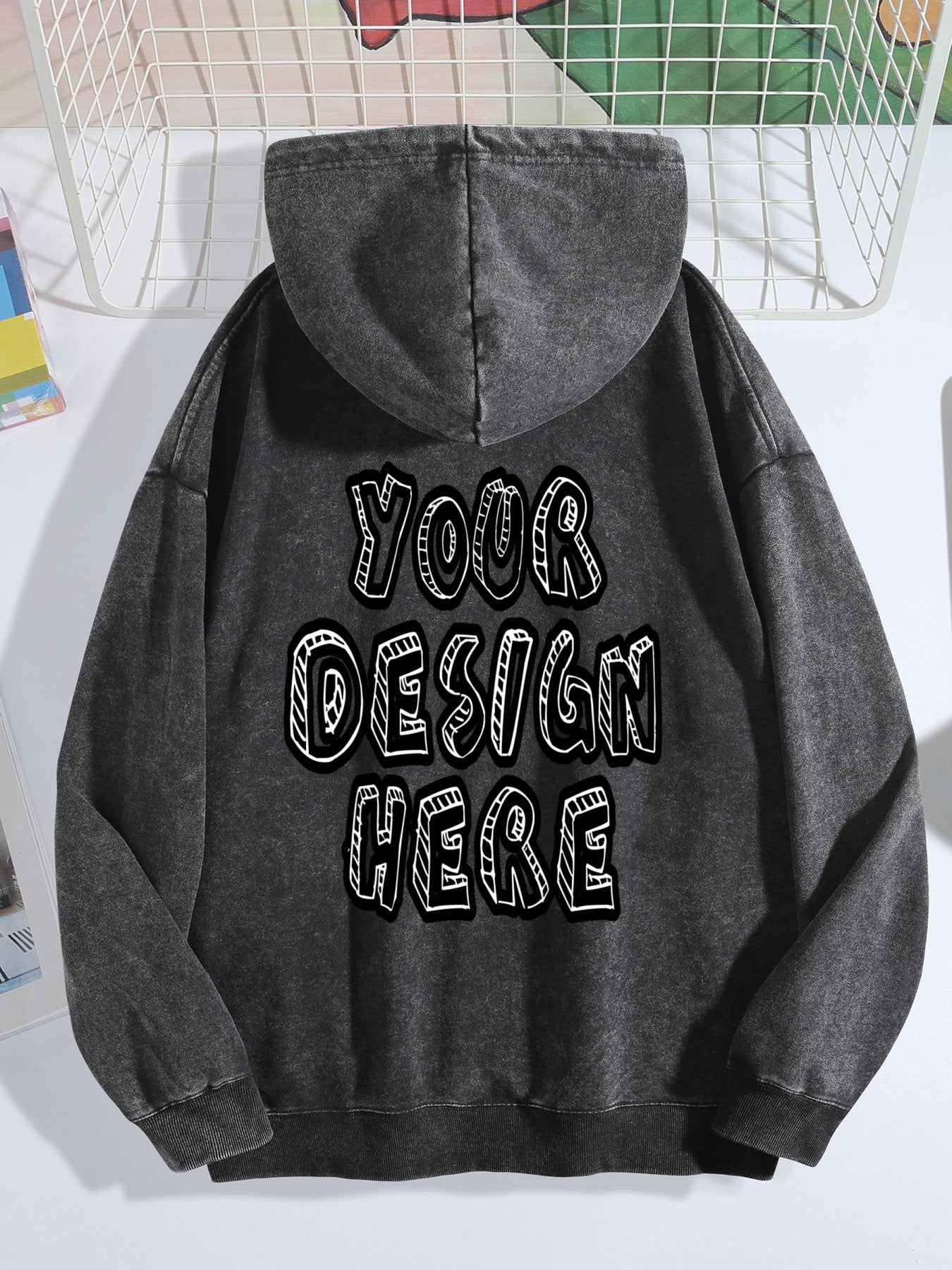 Custom-washed vintage-style black hoodie, back view.
